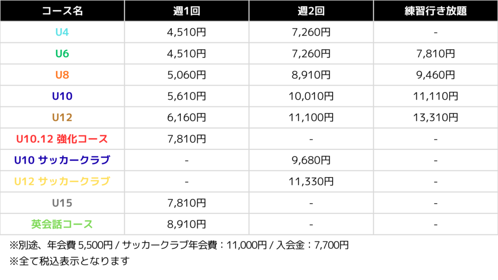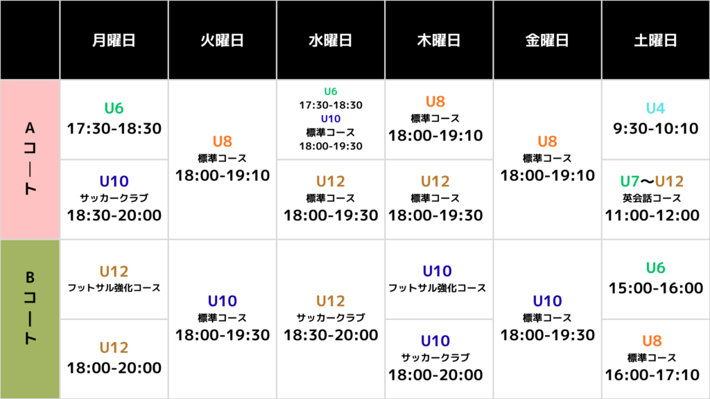 Info各カテゴリーの活動詳細 Scheduleスケジュール ※標準コース:サッカー・フットサルにおいて個人技術の習得※強化コース:フットサルの試合において必要な技術・戦術の習得 Price金額 Location活動会場 PROGRESSIVE FIELD お問い合せフォーム こちらからお問い合せください お問い合せ